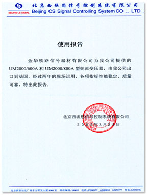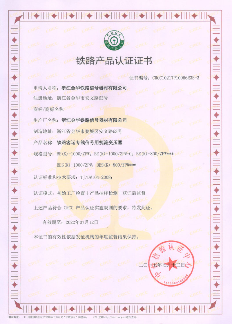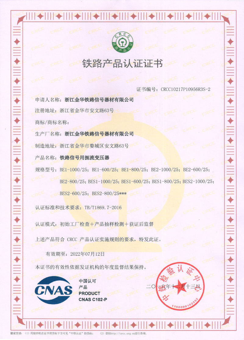 鐵路客運(yùn)專(zhuān)線信號(hào)用扼流變壓器 CRCC認(rèn)證證書(shū)