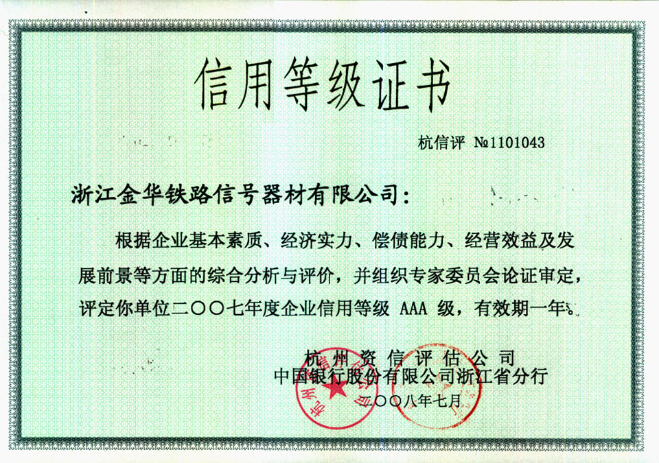 2007年3A級(jí)信用等級(jí)證書(shū)