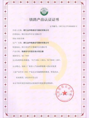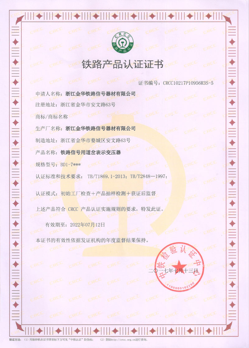 鐵路信號(hào)用道岔表示變壓器 CRCC認(rèn)證證書(shū)