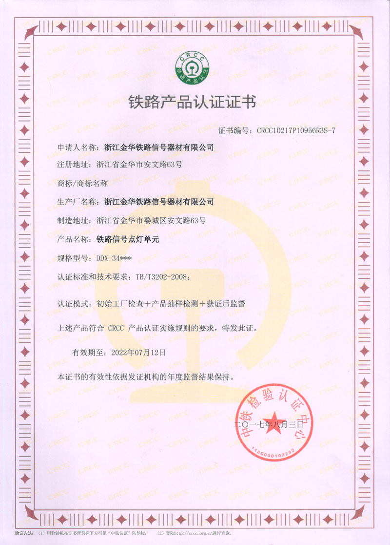 鐵路信號(hào)點(diǎn)燈單元 CRCC認(rèn)證證書(shū)