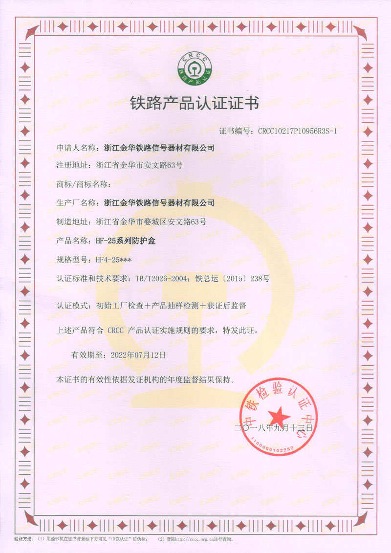 HF-25系列防護(hù)盒 CRCC認(rèn)證證書(shū)