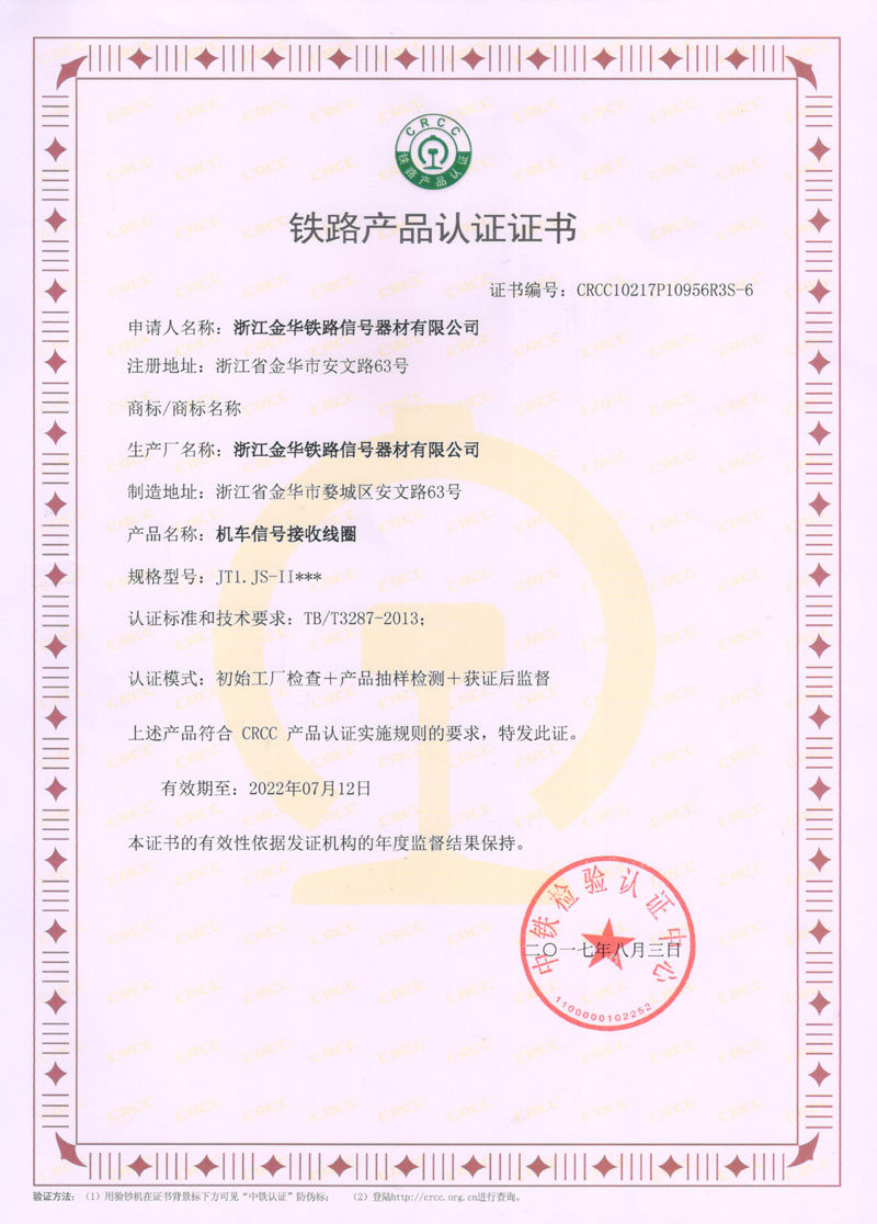機(jī)車(chē)信號(hào)接收線圈 CRCC認(rèn)證證書(shū)